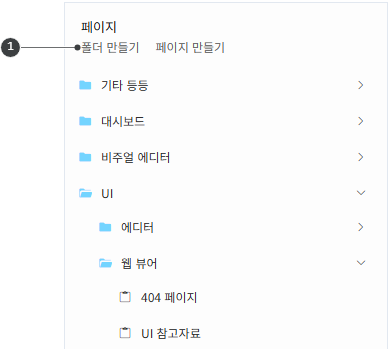 비주얼 문서에서도 1폴더를 만들어 페이지를 관리할 수 있습니다. 페이지를 폴더로 묶어 계층 구조로 관리합니다.