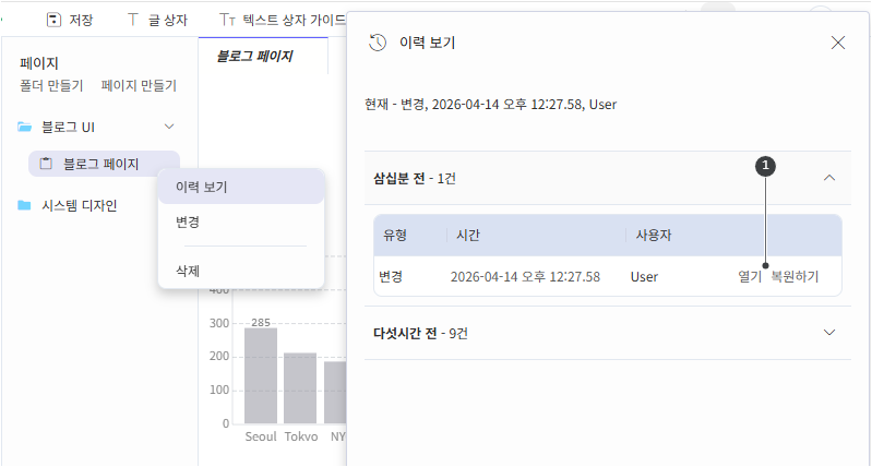 페이지 단위로 편집 이력을 확인할 수 있습니다. <1열기> 링크로 이력을 확인하고, 필요하면 <1복원하기> 링크를 클릭해 해당 이력으로 복원합니다.