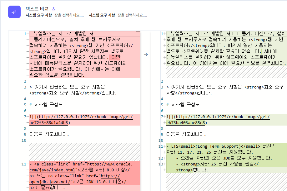 <도구 | 텍스트 비교> 메뉴에서 서로 다른 장을 HTML이 아닌 마크다운으로 비교합니다.
