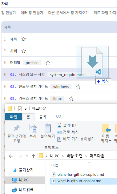 탐색기에서 마크다운 파일(.md)을 ‘문서 차례’에 끌어다 놓으면 해당 파일의 내용으로 새 장을 만들고 장 차례를 자동으로 생성합니다.