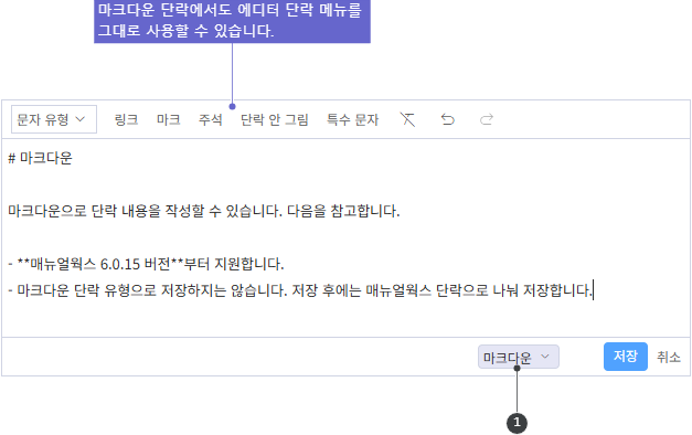 마크다운 단락을 저장하면 매뉴얼웍스 단락 유형에 맞게 자동으로 변환됩니다. 자세한 사항은 마크다운 단락 작성하기를 참고합니다.