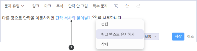 링크를 마우스 오른쪽 버튼으로 클릭한 후 “링크 텍스트 유지하기”를 선택하면 링크 텍스트를 수정하는 모드로 바뀝니다.
