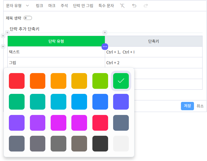 매뉴얼웍스에서는 기본적으로 테마에서 정한 표 머리 셀 색과 표 셀 색을 적용합니다. 6.0.15 버전에서는 개별 셀에 다른 배경색을 따로 설정할 수 있는 기능을 추가했습니다.