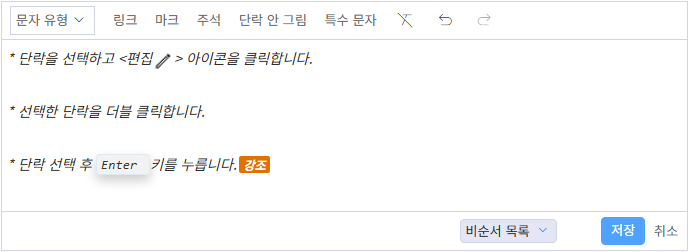 단락이 떨어져 있어 하나하나 편집해야 하는 사용자의 고충을 매뉴얼웍스 6.0.15 버전에 반영했습니다. 이제는 에디터에서 떨어져 있는 여러 단락도 한 번에 선택해 동시에 편집할 수 있습니다.