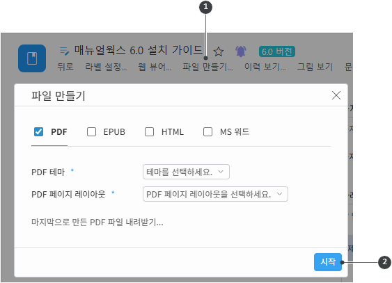 2PDF를 선택한 후, PDF 테마와 페이지 레이아웃을 선택합니다.