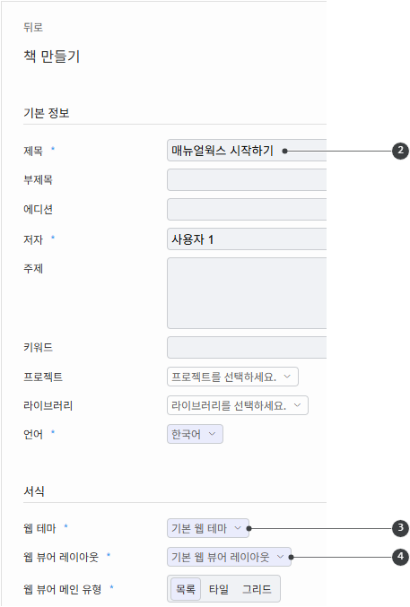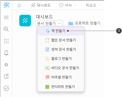 <대시보드> 메뉴에서 <문서 만들기>를 선택한 후 <1책 만들기>를 선택합니다.