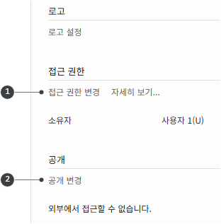 대시보드나 에디터에서 <웹 뷰어> 링크를 클릭하면 웹 뷰어가 열립니다. 기본적으로 해당 문서에 접근 권한이 있는 사용자면 접근할 수 있습니다. <1접근 권한 변경> 링크로 접근할 수 있는 사용자를 추가하거나 <2공개 변경> 링크를 클릭해서 로그인 없이 웹 뷰어에 접근할 수 있도록 설정합니다.