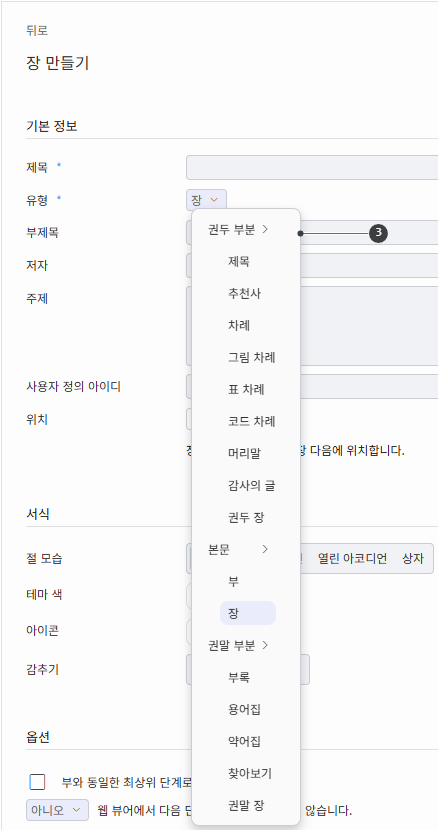 <2장 만들기> 링크를 클릭해서 장을 만듭니다. 3장 유형에 따라 조금씩 모습이 달라집니다. 기본적으로 장을 선택합니다.
