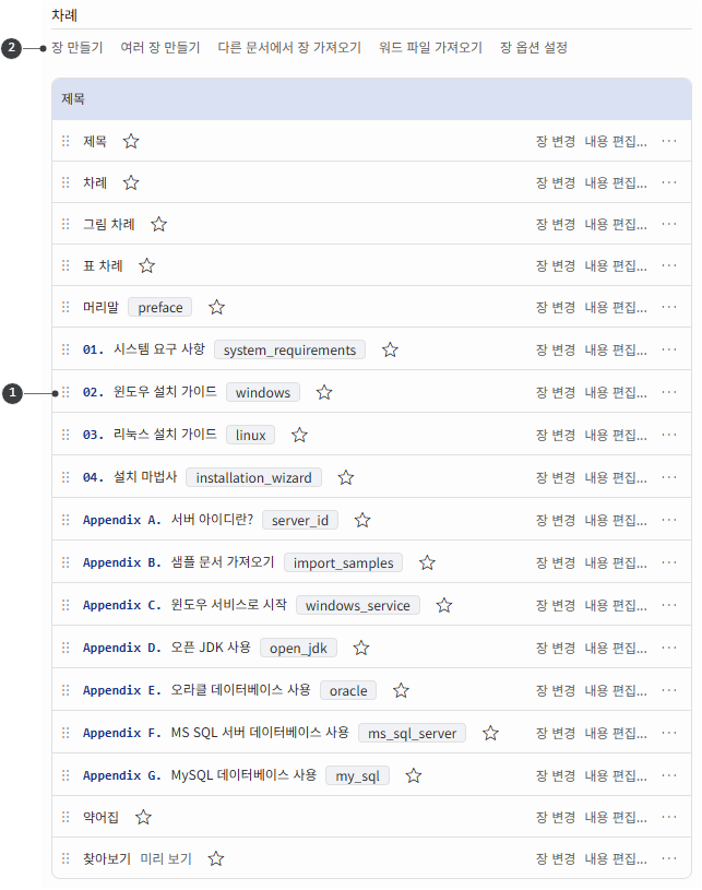 매뉴얼웍스는 장 단위로 문서를 편집합니다. 문서를 만들고 가장 처음해야 하는 일은, 여러 장을 만들고 장의 차례를 구성하는 것입니다. 샘플 문서 중 하나인 매뉴얼웍스 6.0 설치 가이드의 장 차례는 다음과 같습니다.