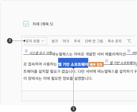 매뉴얼웍스는 직접적으로 글자를 진하게 하거나 색상을 설정하는 기능이 없습니다. 대신 문자 유형을 지정하고, 테마에서 일괄적으로 서식을 설정합니다.