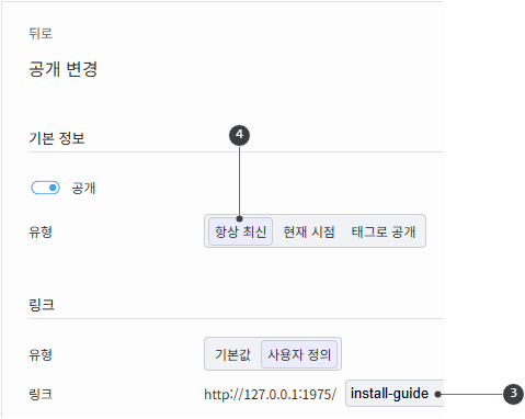 공개할 때 링크 주소에 3install-guide와 같은 임의의 값을 입력할 수 있습니다.