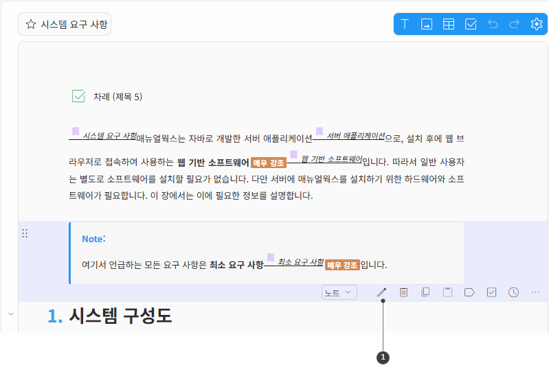 단락 단위로 내용을 편집하는 것이 매뉴얼웍스 에디터의 가장 큰 특징입니다. 단락을 편집할 때는 단락을 선택한 후 Enter 키를 누르거나 1아이콘을 클릭합니다.