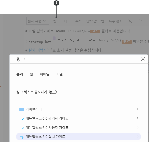 링크를 설정할 영역을 선택한 후 1링크를 클릭합니다. 매뉴얼웍스에서 작성한 문서를 선택하거나, 웹 URL/이메일 등을 설정하거나 파일을 선택할 수 있습니다.