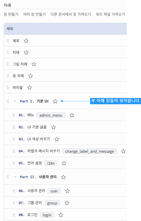 장 유형으로 부를 선택하면 다음에 오는 장들이 부 아래에 위치합니다. 다음은 샘플 문서 중에 하나인 매뉴얼웍스 6.0 관리자 가이드의 장 차례입니다.