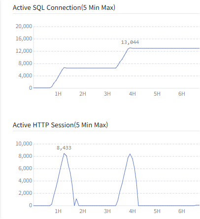 악성 트래픽이 늘면 HTTP 세션과 SQL 연결이 급격히 증가합니다.