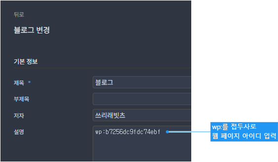 여기서 작성한 내용을 블로그 설명 항목에 저장합니다. HTML이 내용이 길면 오류가 발생합니다. 이 때는 웹 페이지를 선택한 다음과 같이 설명 항목에 넣어 작성합니다.