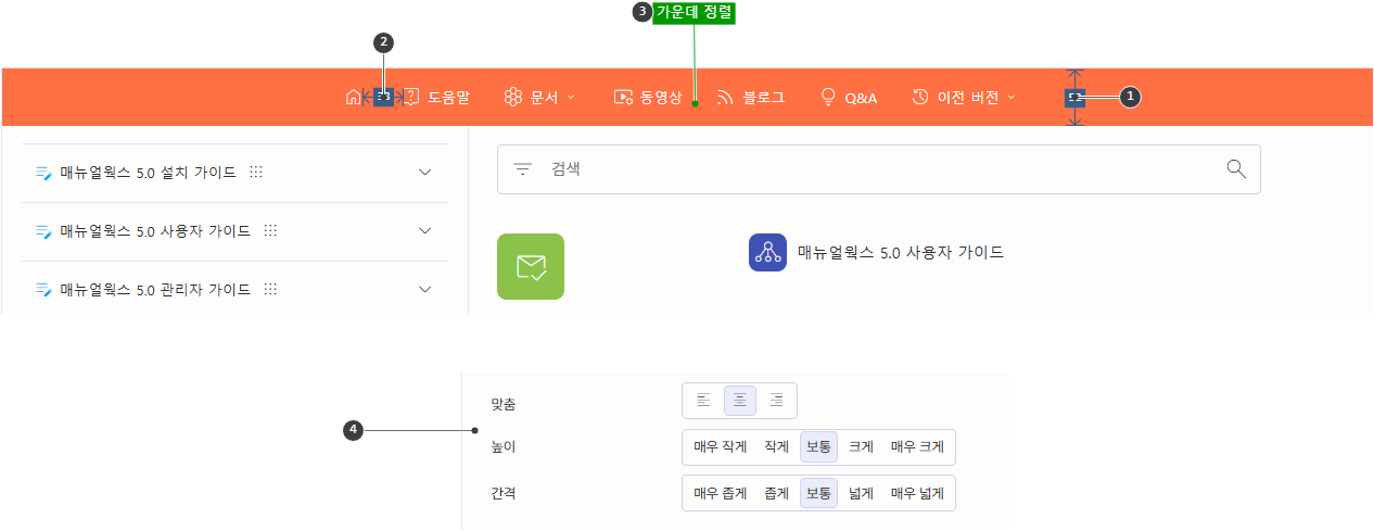 라이브러리 1메뉴 바의 ‘높이’와 2메뉴 간의 ‘간격’, “3맞춤”을 4라이브러리 만들기(라이브러리 변경) <서식>에서 설정할 수 있습니다.
