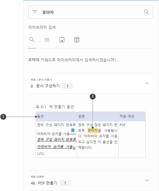 검색 결과에서 표 단락은 모든 행을 보여주지 않고, 1머리/바닥 행과 2찾은 단어가 있는 행만 보여줍니다.