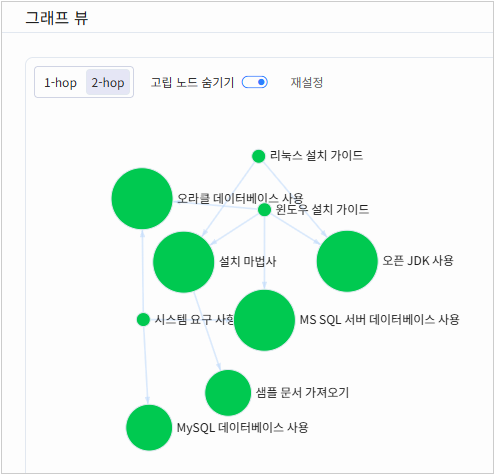 <리소스 |관련문서=""> 메뉴에서 <그래프 뷰=""> 링크를 클릭하면 개별 문서 단위로 장 사이의 연결을 보여줍니다.그래프>리소스>