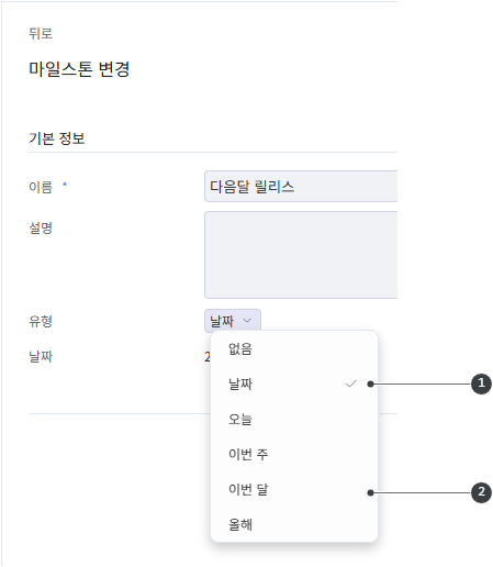 마일스톤에 날짜를 설정합니다. 1직접 날짜를 지정하거나 "2이번 달"와 같이 키워드로 설정합니다.
