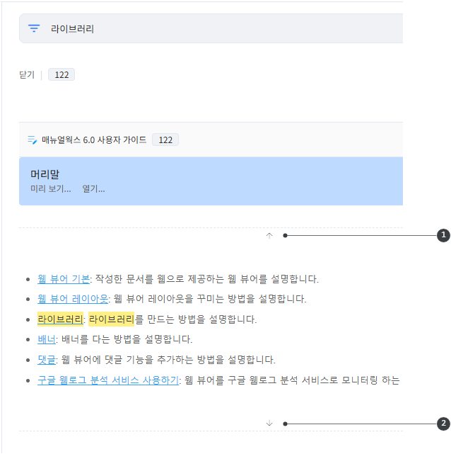 웹 뷰어로 이동하지 않고 검색어가 들어간 단락의 앞뒤 단락을 바로 확인합니다.
