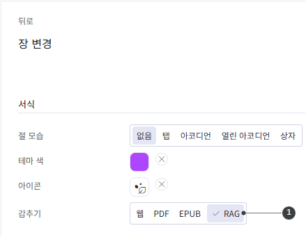 웹, PDF, EPUB 감추기 기능과 동일하게 적용합니다. 장은 장 변경 화면에서, 단락은 에디터 단락 옵션에서 설정할 수 있습니다. RAG에서 제외된 항목은 벡터 저장소 생성 대상에서 자동으로 제외됩니다.