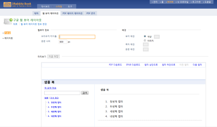 웹 뷰어 레이아웃이란 웹 뷰어의 모양을 일부 조정할 수 있도록 웹 뷰어의 각 요소에 대한 설정을 변경할 수 있는 기능입니다. 여러 개의 레이아웃을 등록하여 책마다 개별적으로 적용할 수 있습니다.