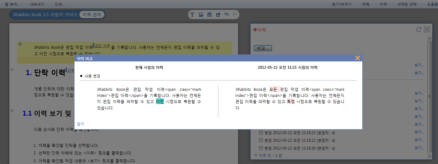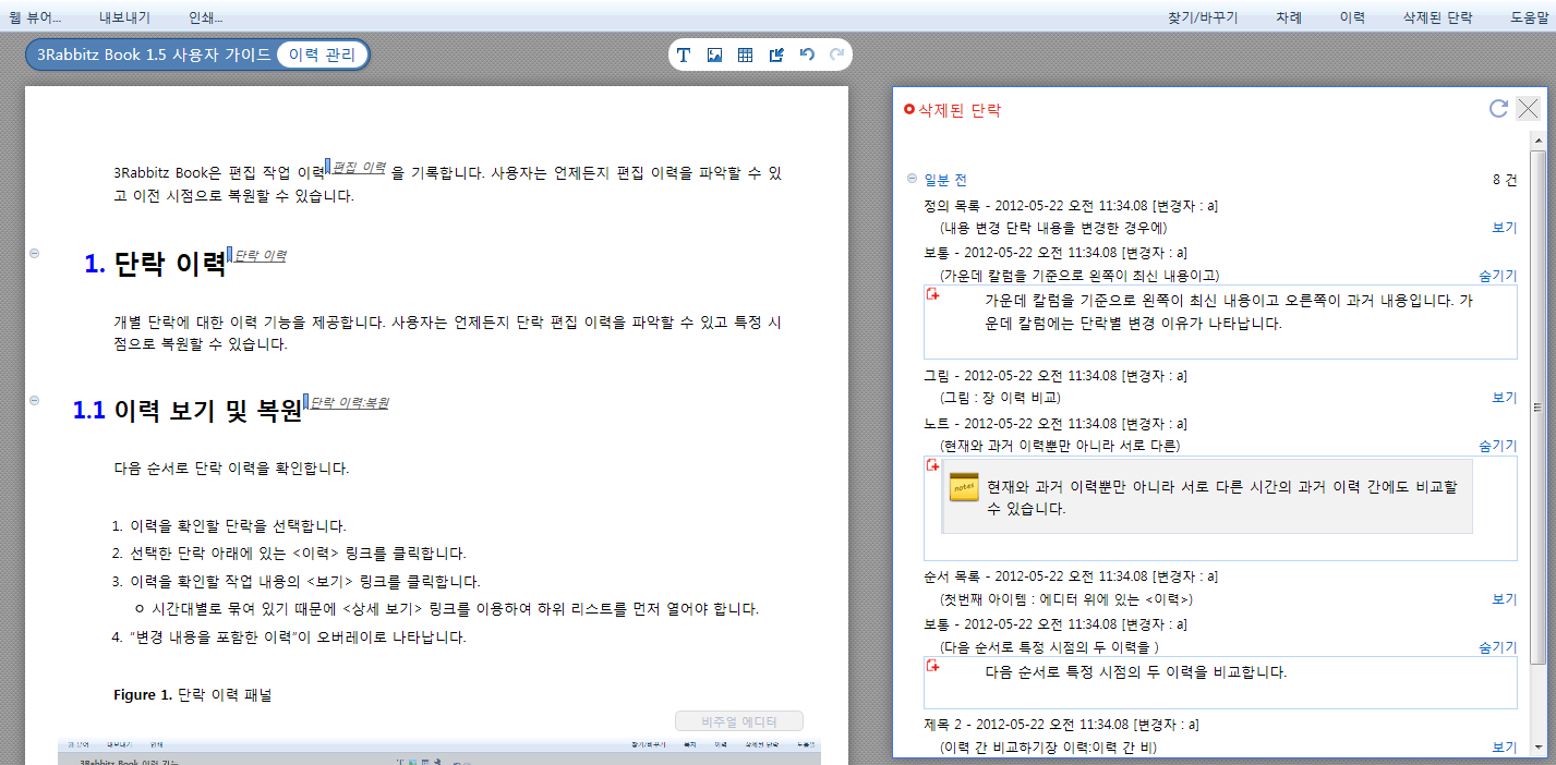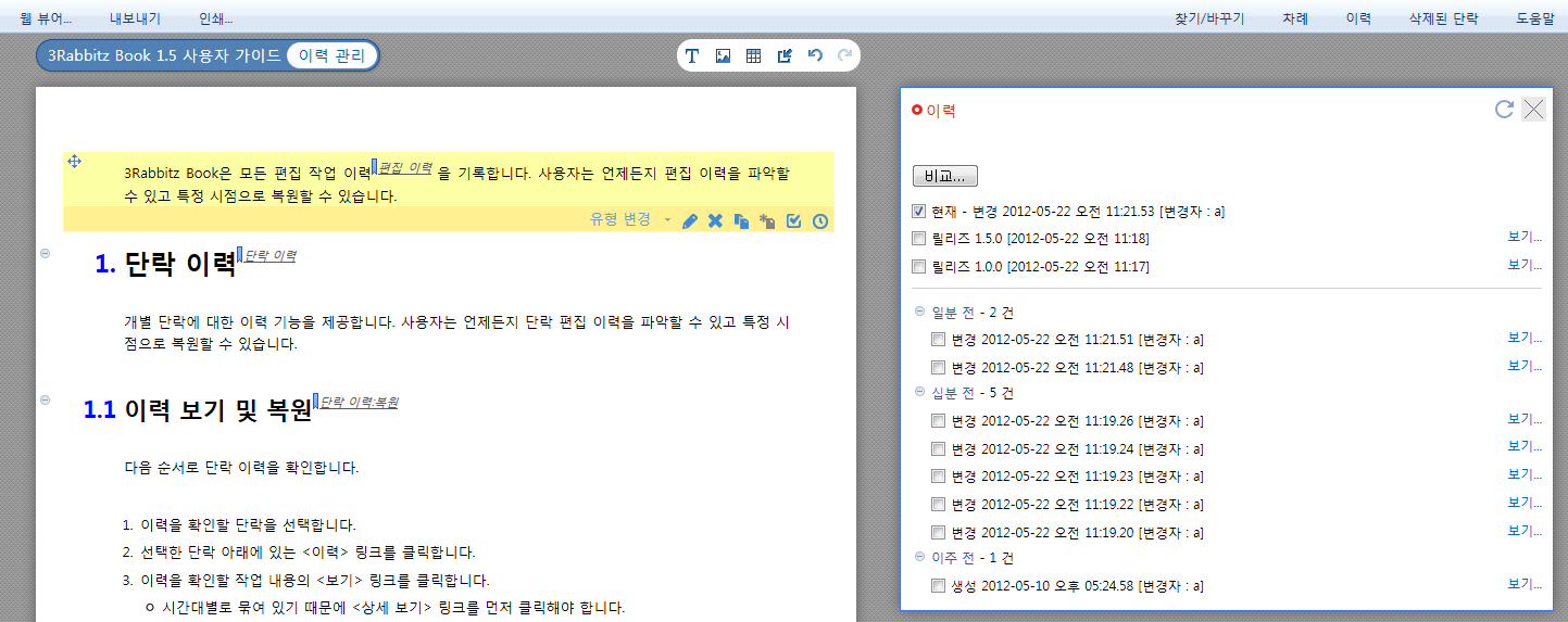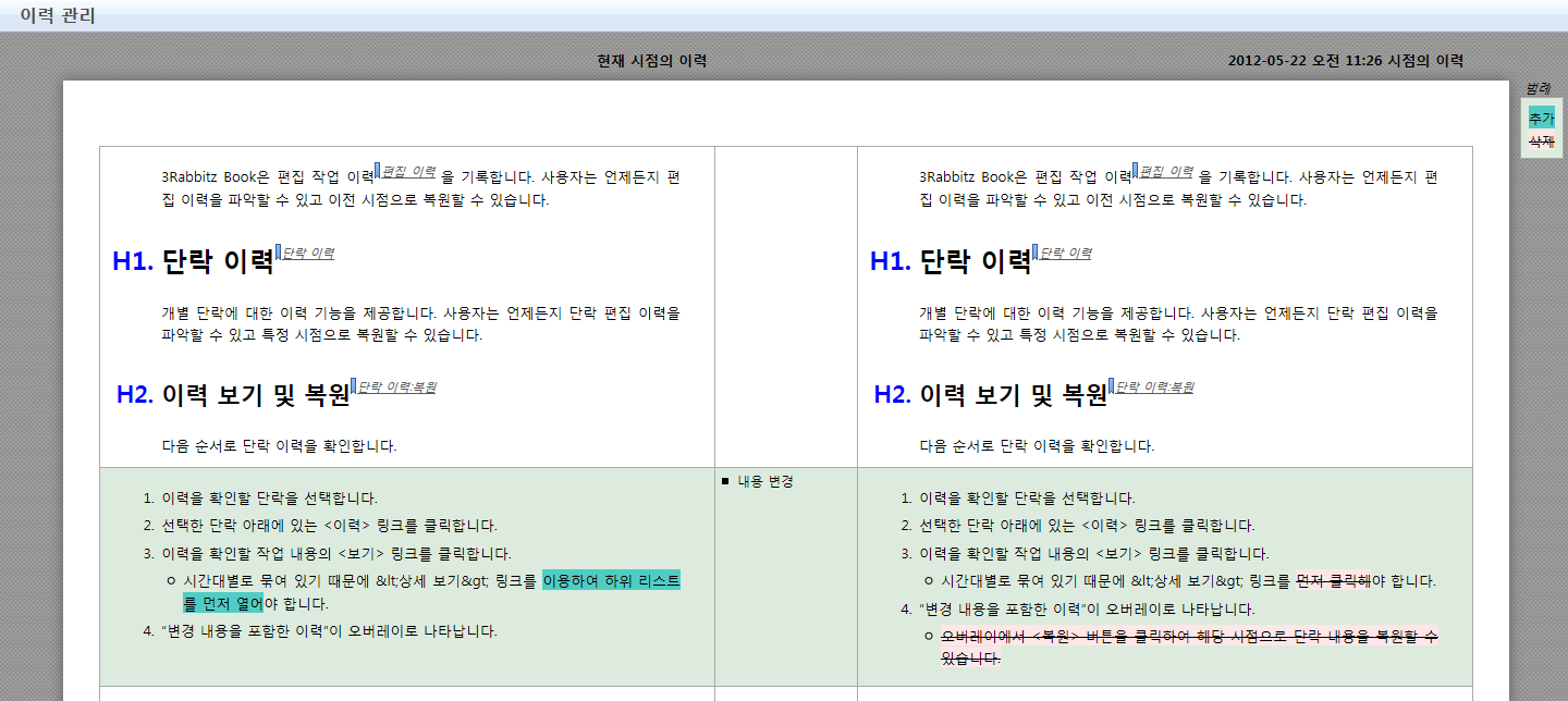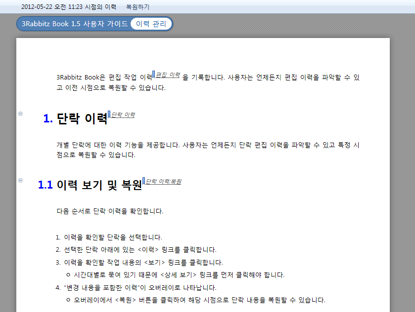 3Rabbitz Book은 모든 편집 작업 이력을 기록합니다. 사용자는 언제든지 편집 이력을 파악할 수 있고 특정 시점으로 복원할 수 있습니다.