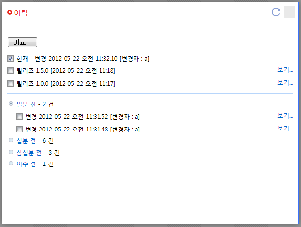 비교할 이력을 선택합니다. (기본으로 “현재”가 선택되어 있습니다.)