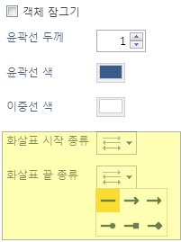 선 객체에 대해서는 화살표 시작 종류와 끝 종류를 설정할 수 있습니다.