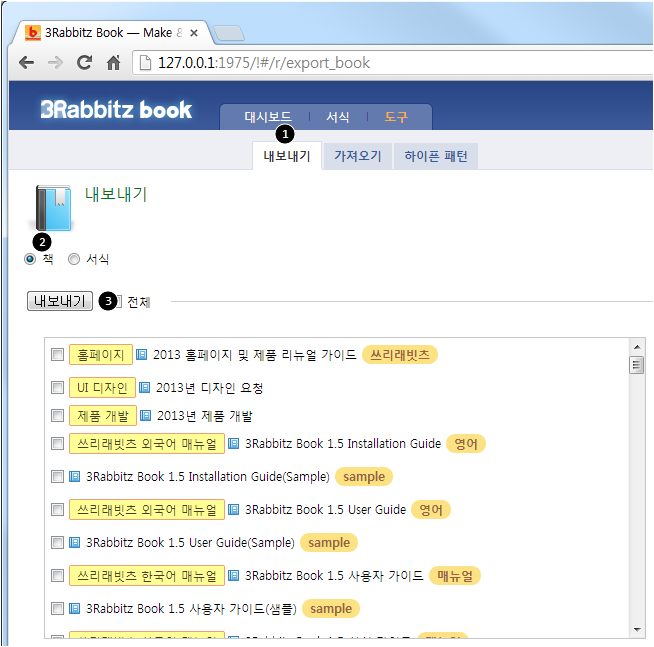 내보낼 책을 선택한 후 <3내보내기> 버튼을 클릭합니다.
