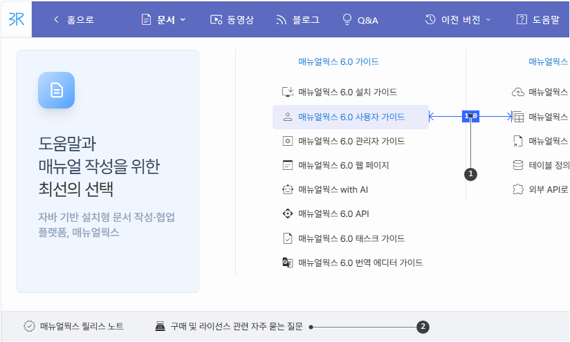 책과 짧은 문서, 정적 문서 등을 HTML로 만듭니다. 토픽 문서와 블로그, 비디오 문서는 설치한 매뉴얼웍스 서버 링크로 처리합니다.