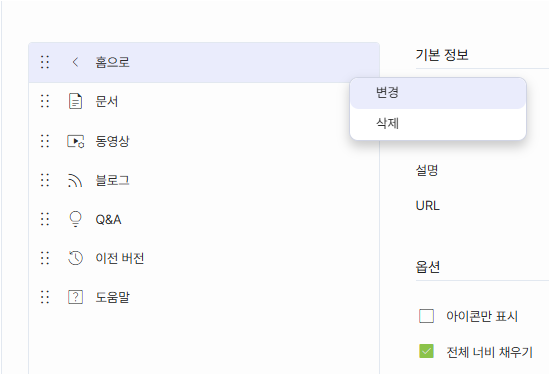 아이콘을 끌어다 놓는 방식으로 다음과 같이 메뉴, 칼럼 등의 순서나 위치를 바꿉니다.