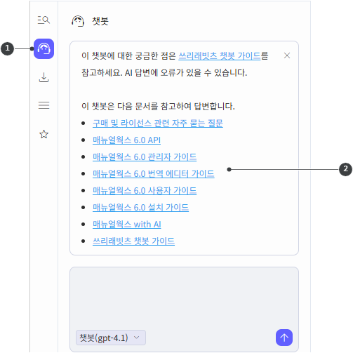 “챗봇이 표시되는 문서”를 설정하면 해당 문서의 웹 뷰어 사이드바에 <1챗봇> 아이콘이 생성됩니다. 이 아이콘을 클릭하면 사이드 패널에 2해당 챗봇이 참고하는 문서를 보여줍니다.