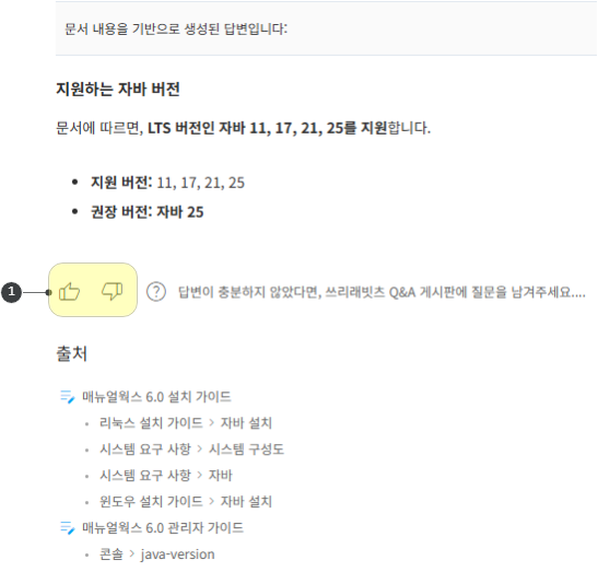 사용자가 답변에 대해 1피드백을 남깁니다. 남긴 피드백은 <AI | AI 사용량> 메뉴에서 확인합니다.