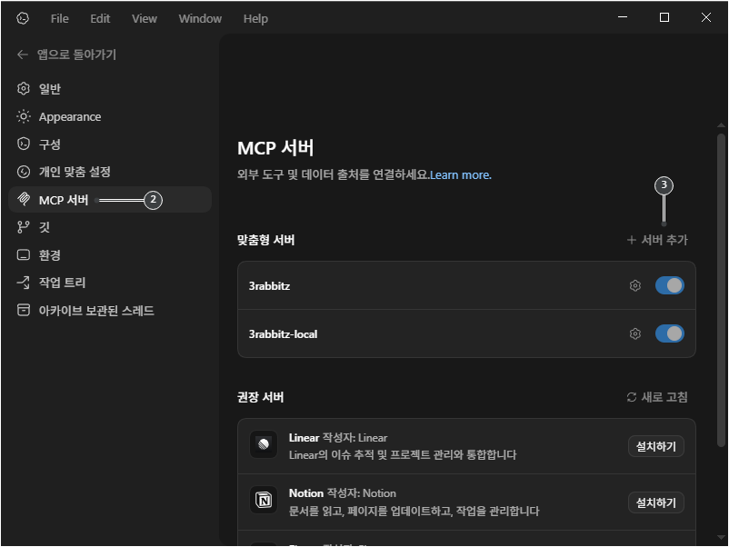 <2MCP 서버> 메뉴를 선택한 후 <3서버 추가> 링크를 클릭합니다.