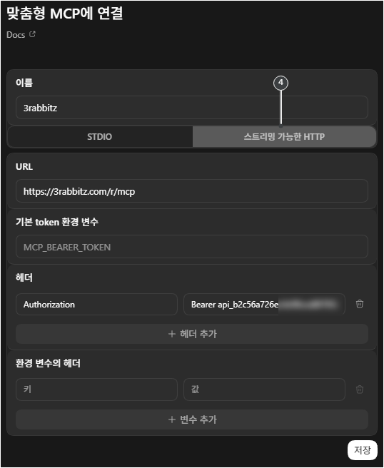 Authorization를 입력하고 API 키를 설정합니다. 값은 Bearer api_로 시작합니다.