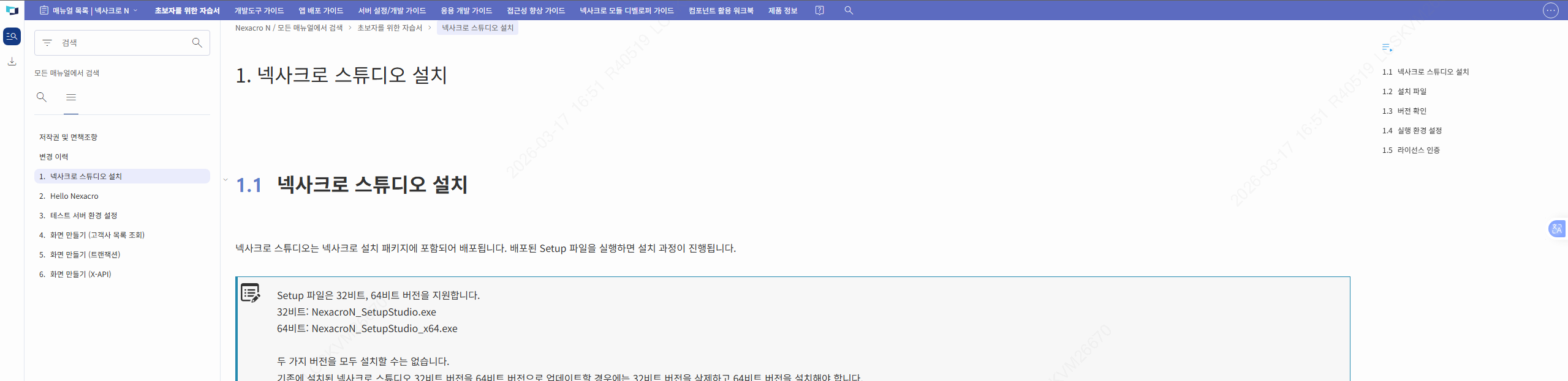 ex) 투비소프트 메뉴얼을 예로 들면 좌측 네비게이션에서 1. 넥스크로 스튜디오 설치는 아코디언이 보이지 않지만, 장에서 보이는 세부 목차는 우측 장 차례에서 보이고 있습니다. https://docs.tobesoft.com/getting_started_nexacro_n_ko/1a8c8e68a182acba
