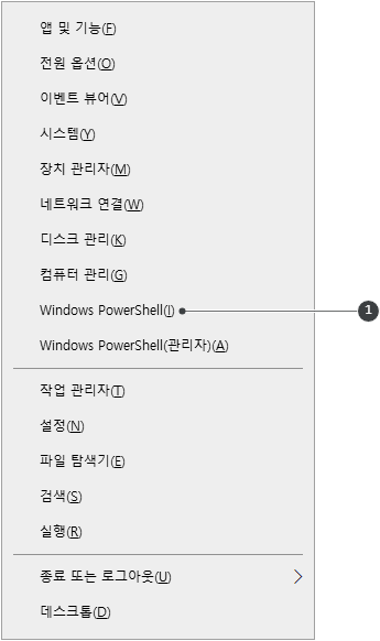 윈도우 + X 단축키를 누르면 나타나는 콘텍스트 메뉴에서 <1Windows PowerShell> 메뉴를 선택합니다.